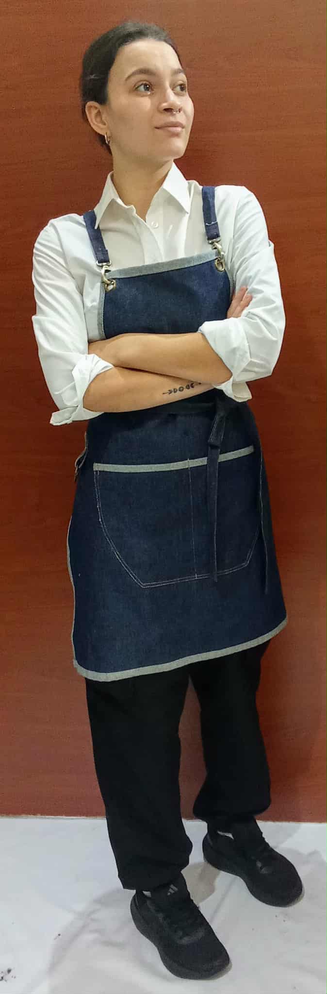 Ποδιά σέρβις (τύπου μπαρίστα) τζιν ύφασμα με δερμάτινες ή καστόρ λεπτομέριες. Διαθέτει μια διπλή τσέπη μπροστά και δένει χιαστί πίσω.