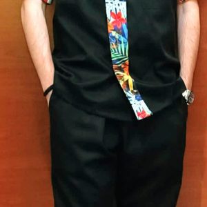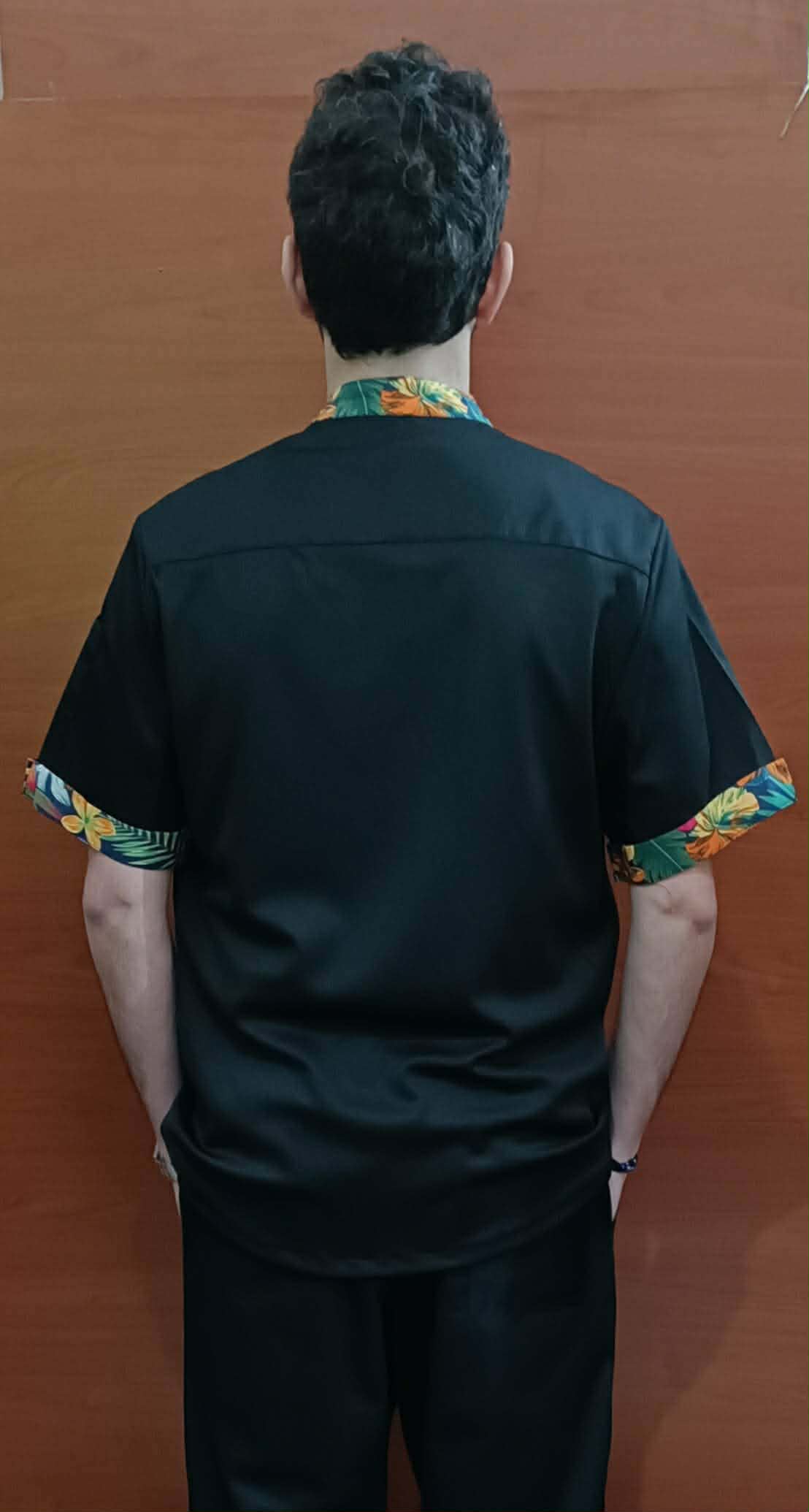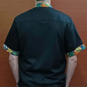 Σακάκι σεφ κοντομάνικο μαύρο hawaiian. Ο γιακάς, το μπροστινό μέρος και το μανίκι συμπληρώνονται από hawaiian εμπριμέ ύφασμα.